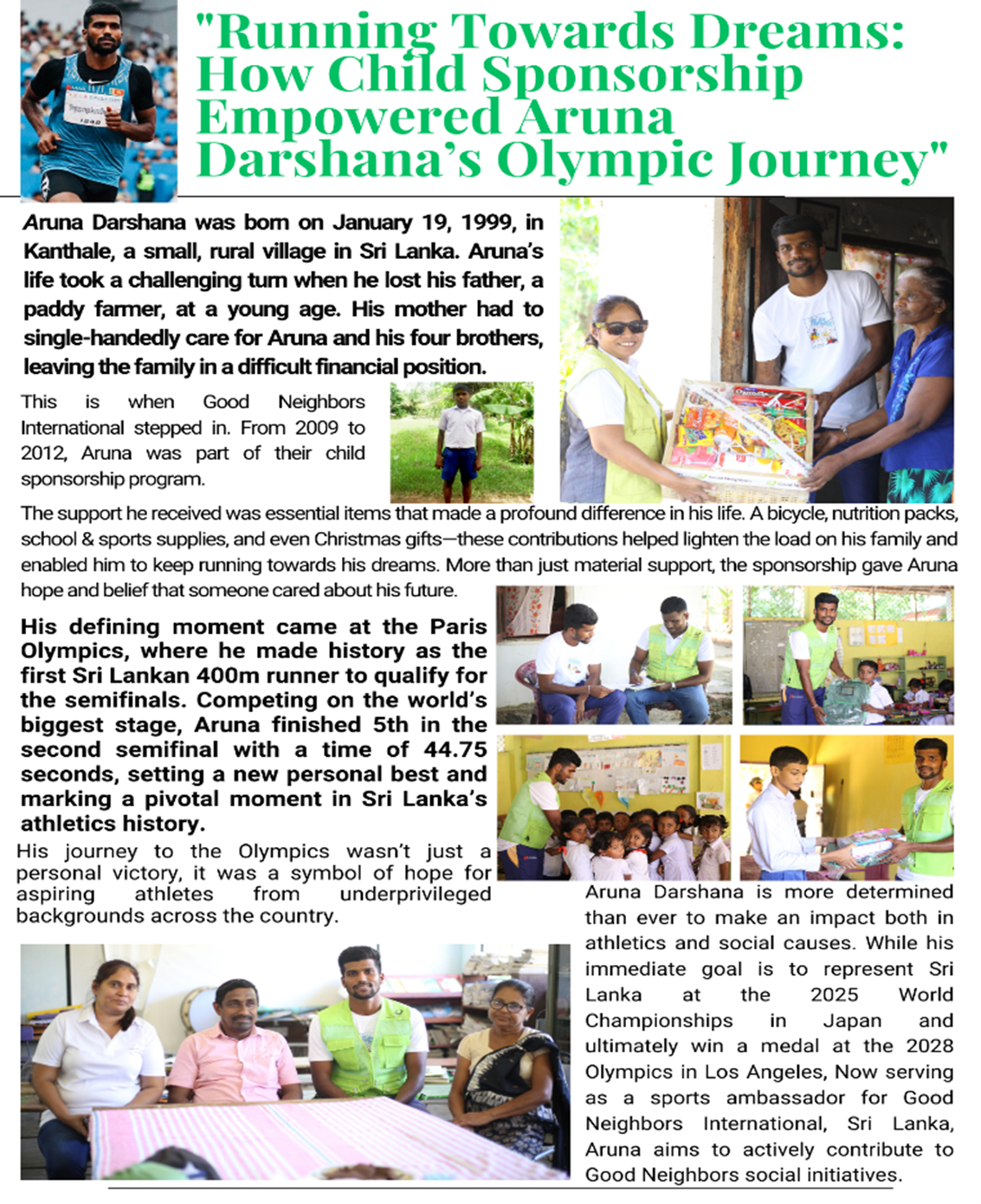 News & Stories STRENGTHENING COMMUNITY HEALTH Empowering 1,200+ Girls : Launching a Sustainable Menstrual Health Revolution in Puttalam Good Neighbors Sri Lanka and Department of Education Sign MoU to Enhance the Capacity of Educational Institutions Running Towards Dreams: How Child Sponsorship Empowered Aruna Darshana’s Olympic Journey